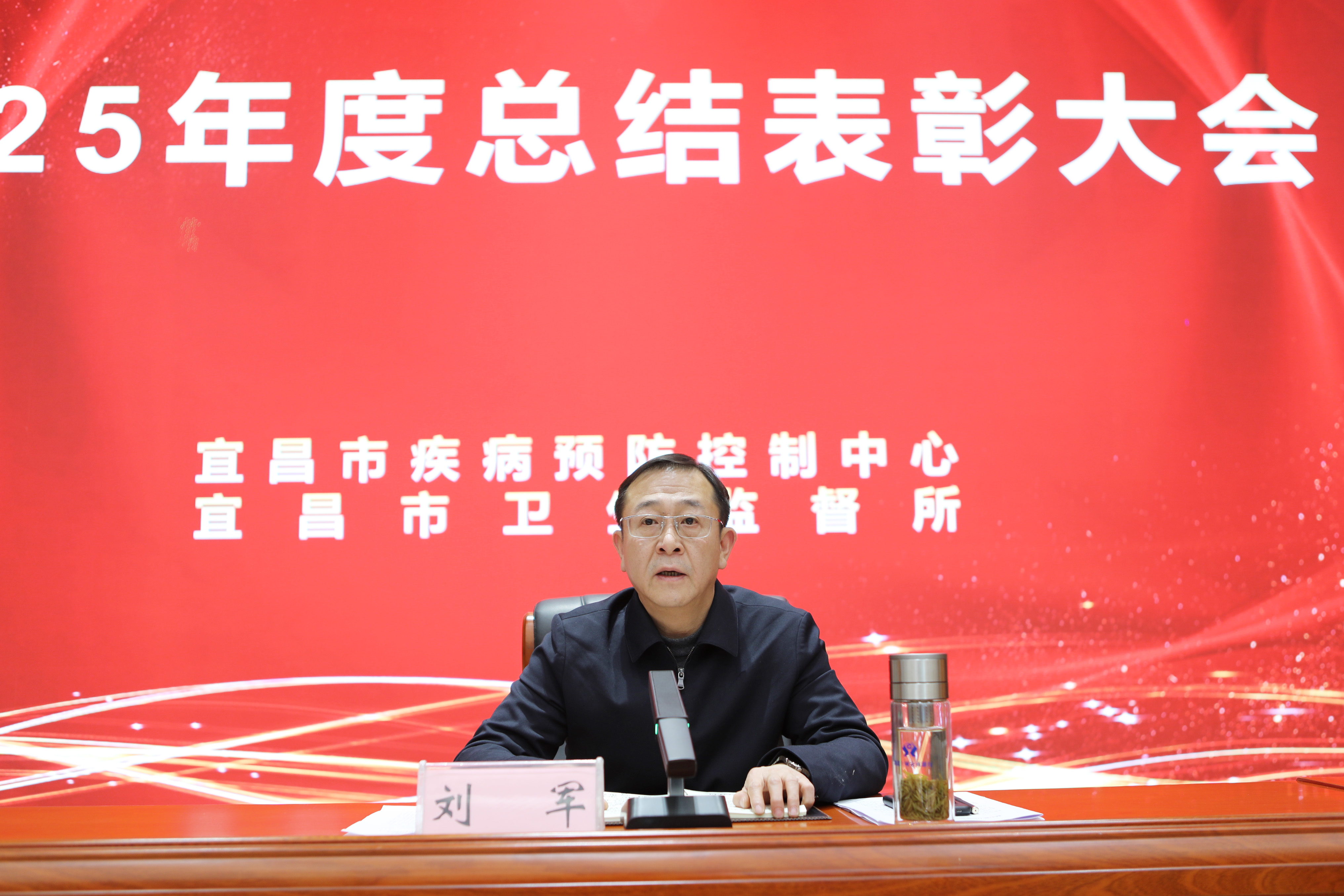 刘军局长对获得表彰的集体和个人表示了热烈祝贺,并对市疾控中心全体干部职工及其家属表示了亲切问候。他指出,2025年是极不平凡的一年,市疾控中心全体干部职工在中心党委的团结带领下,国家慢病重大科技专项落地宜昌、推动出台国内首部健康影响评估地方性法规、健康医疗大数据协同试点等创新工作走在全国前列,蝉联全国文明单位、高层次人才引育、卫生监督执法、专业技能竞赛等多项工作可圈可点,值得充分肯定。他强调,面向“十五五”新征程,市疾控中心要坚持问题导向,围绕“加强政治建设、全面深化改革、全面履行职责、勇于创新驱动、推动高质量发展、提升能力素质、维护安全稳定”等七个方面工作精准发力、久久为功,为助力全市卫生健康工作高质量发展贡献疾控力量。