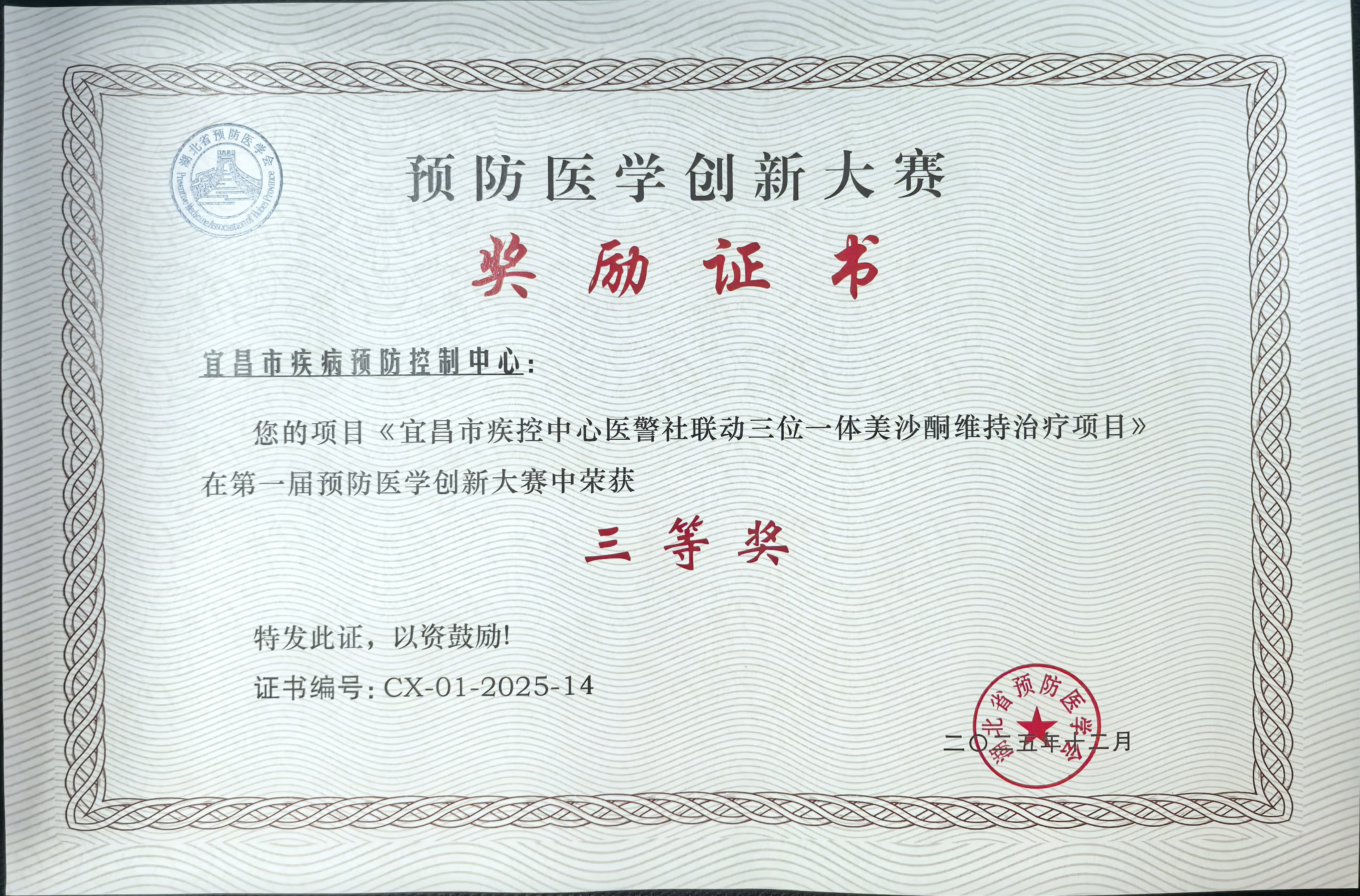 近日,从湖北省预防医学会传来喜讯,在第一届预防医学创新大赛中,宜昌市疾病预防控制中心凭借《宜昌市疾控中心医警社联动三位一体美沙酮维持治疗项目》斩获三等奖,这份省级荣誉,既是对宜昌疾控创新实践的充分认可,也生动彰显了全体疾控人在公共卫生服务领域的务实成效与使命担当。