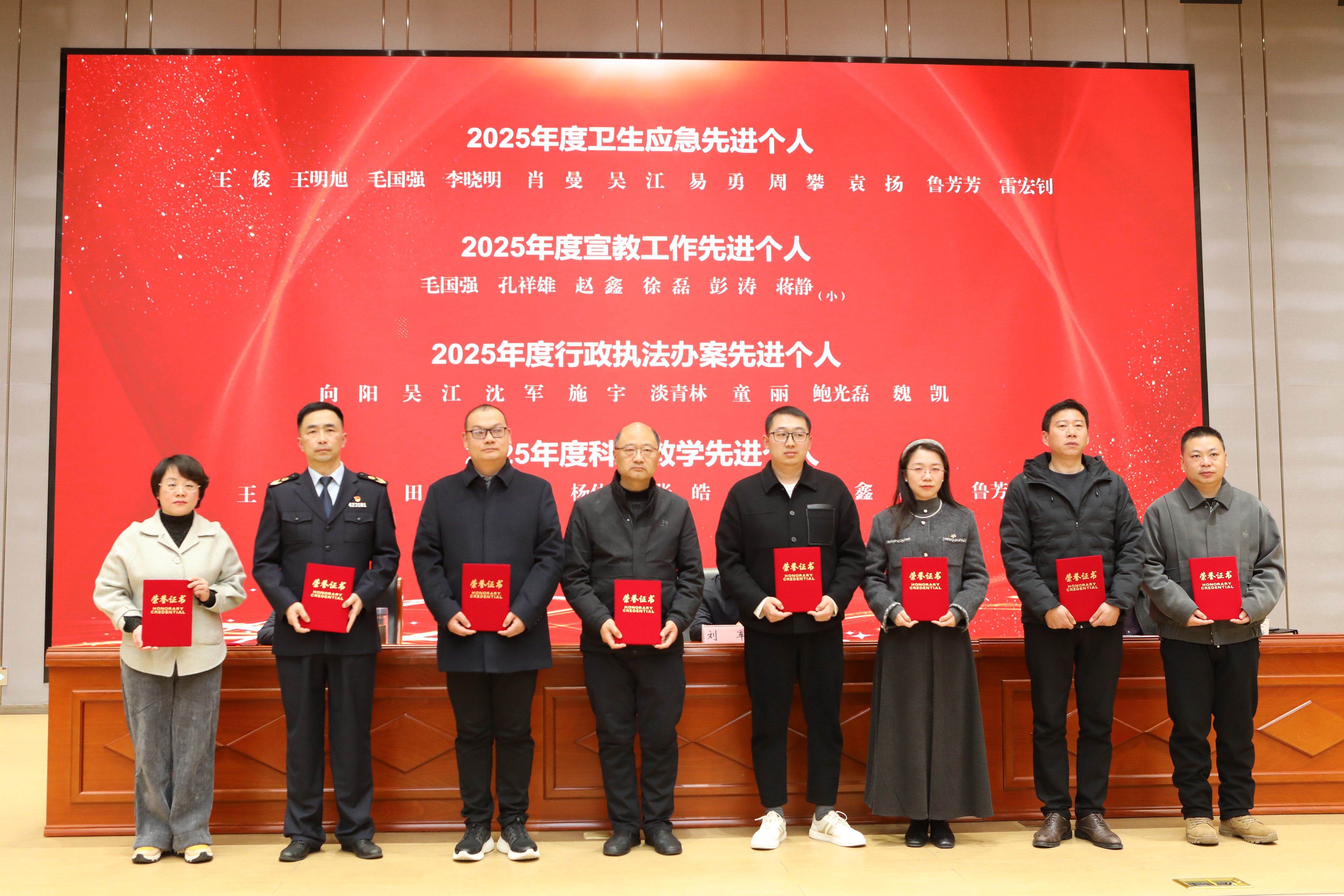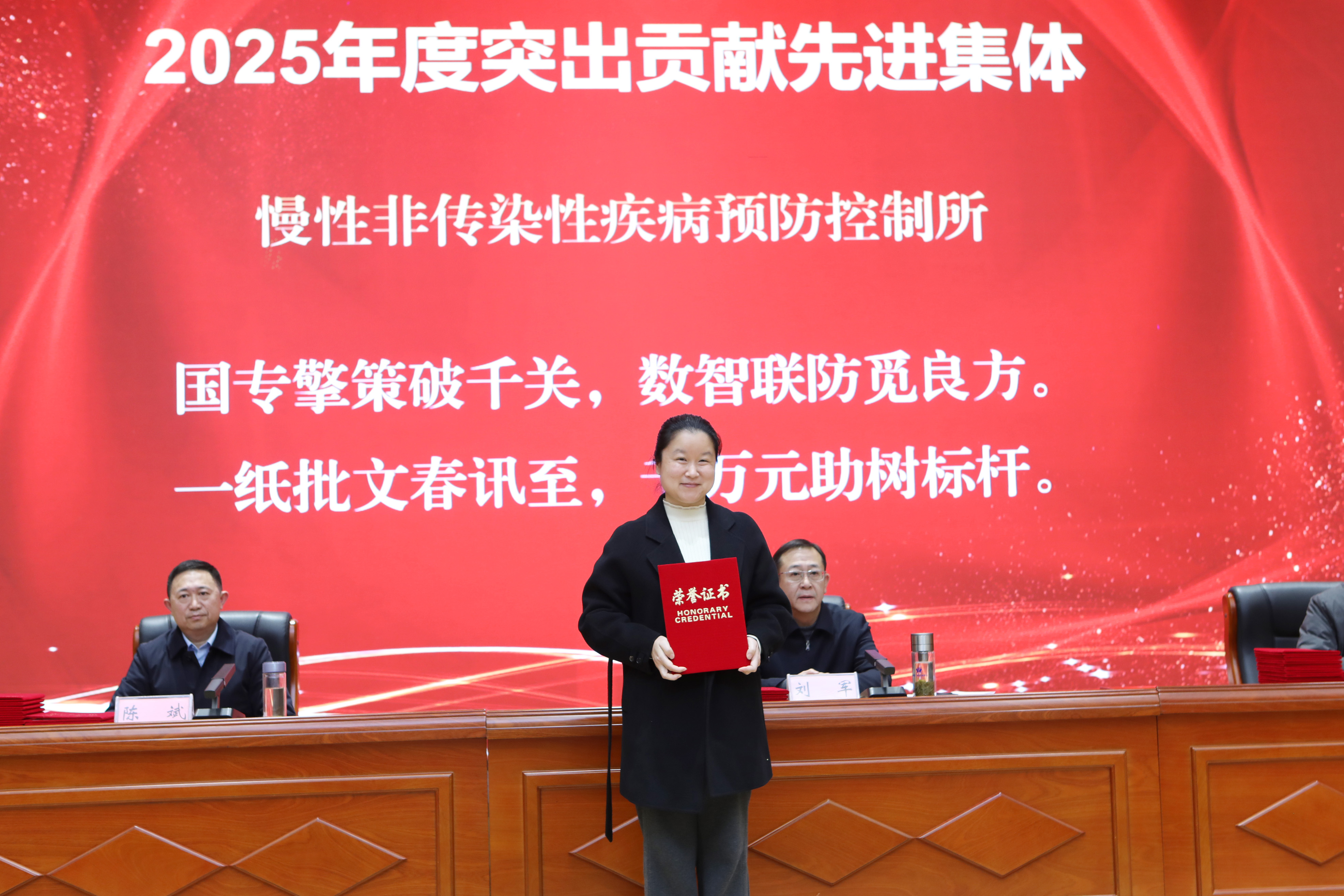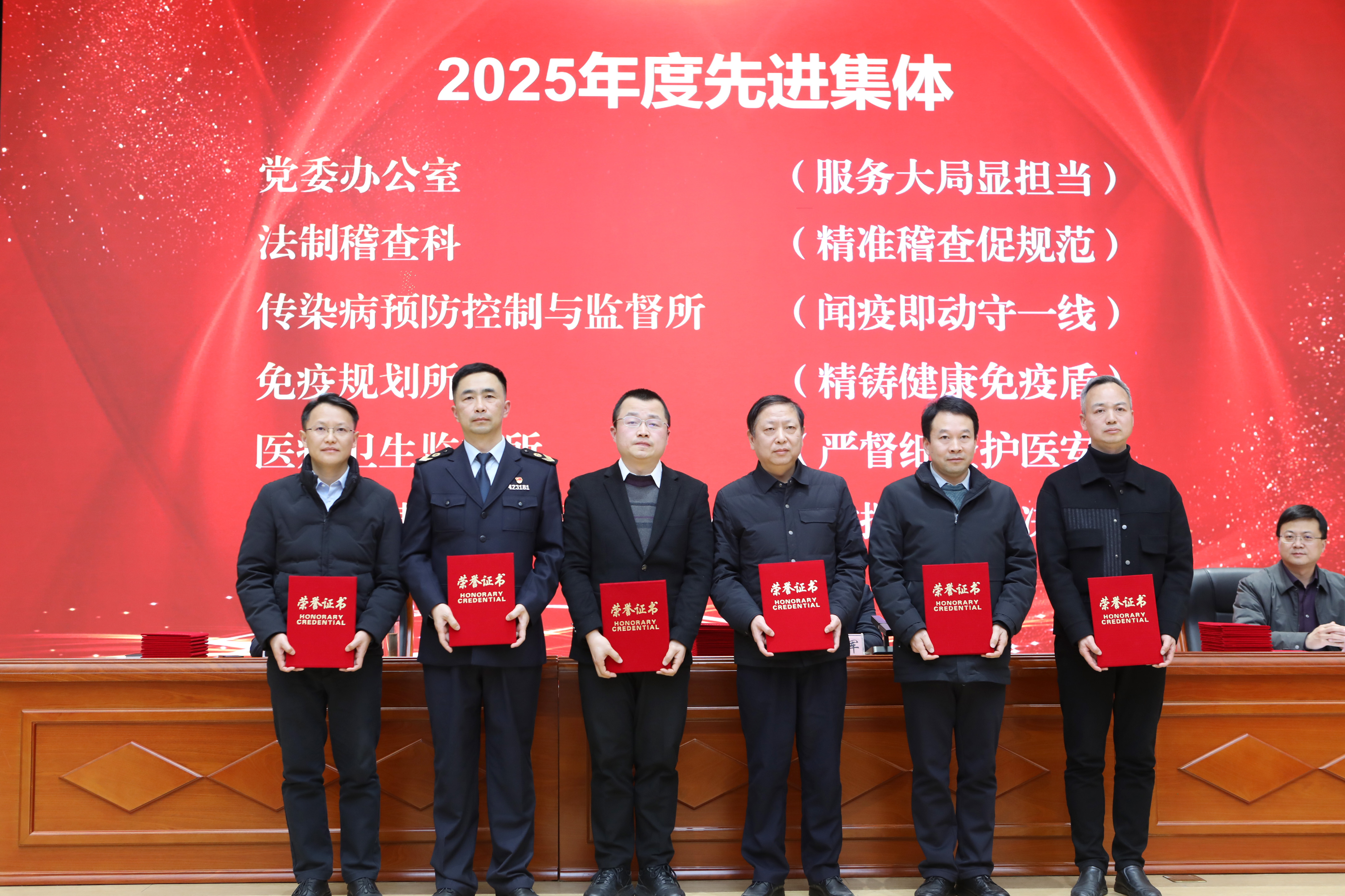 刘军局长对获得表彰的集体和个人表示了热烈祝贺,并对市疾控中心全体干部职工及其家属表示了亲切问候。他指出,2025年是极不平凡的一年,市疾控中心全体干部职工在中心党委的团结带领下,国家慢病重大科技专项落地宜昌、推动出台国内首部健康影响评估地方性法规、健康医疗大数据协同试点等创新工作走在全国前列,蝉联全国文明单位、高层次人才引育、卫生监督执法、专业技能竞赛等多项工作可圈可点,值得充分肯定。他强调,面向“十五五”新征程,市疾控中心要坚持问题导向,围绕“加强政治建设、全面深化改革、全面履行职责、勇于创新驱动、推动高质量发展、提升能力素质、维护安全稳定”等七个方面工作精准发力、久久为功,为助力全市卫生健康工作高质量发展贡献疾控力量。